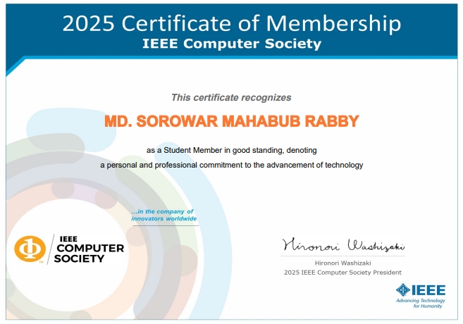 My name is MD. SOROWAR MAHABUB RABBY, and I am passionate about advancing my studies in Computer Science. I am currently seeking opportunities for fully funded Ph.D. programs where I can contribute my skills in Machine/ Deep Learning, Computer Vision, Image Procerssing and Artificial Intelligence.